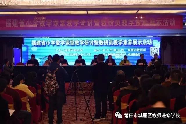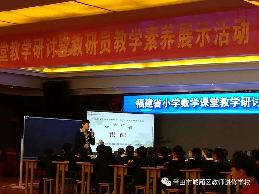 12月14日-15日,福建省小学数学教学研讨暨教研员教学素养展示在晋江安海宝辉酒店圆满举行。活动由福建省普教室主办,泉州市教育局、泉州教科所、晋江教师进修学校、安海镇教委办协办,晋江市安海镇养正中心小学承办,三百多名来自全省各地教研员和来自晋江、安海的骨干教师参加了本次会议,共有11名教研员上台展示自己教学风采,我校林海萍老师代表莆田市上台展示。她首先执教(人教版二年级)《数学广角---搭配(一)》一课,她的语言简明、指向清晰,课堂上充分关注学生。“你听明白他刚才的方法了吗”、“你听明白了什么”、“这个方法好在哪儿”。学生在观察、对比、交流中,经历数学活动,培养学生有序、全面的思考问题。随后马上进行5分钟的教学分享,阐述备课思考;并再用5分钟当场解答与会老师根据课例提出的问题。课后,还要由电脑屏幕随机抽取为另外执教的教研员作点评,整个活动,紧张刺激,意味着教研员们既要准备自己上课,又要随时能为同伴评课,大大考验教研员的基本素养。活动的参与,更加激励教研员要“加强学习,练练课感,走近学生”,更大力度地发挥教研员的作用。